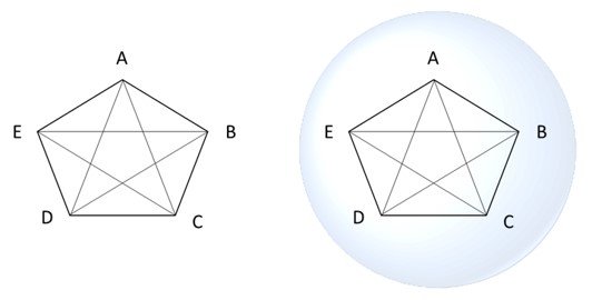 In the second diagram, the sphere represents something quite different – the sphere is "other" than the sum of the pentagon's parts and even the complexity of their relationships. Instead, the sphere represents a "field" in which the system exists. It is a concrete representation of what we might consider the subtle field of "culture." If the diagram were of a family, the sphere would likely be felt but not clearly defined or seen. It would be the "air" in which the family acts. What is not clear from the diagram is that this "field" of culture has a great deal to do with how the parts arrange themselves. That there is a pentagon – and that it is in this shape rather than a circle or some other pattern is, at least in large measure, a function of the unseen "sphere" of culture. The problem, however, is more insidious than this. The definition of the sphere in the second diagram created an object that you can focus on – it transformed "ground" into "figure". You can see the sphere. In fact, culture is much more like the screen or paper "in" which the diagram (without the sphere) appears.